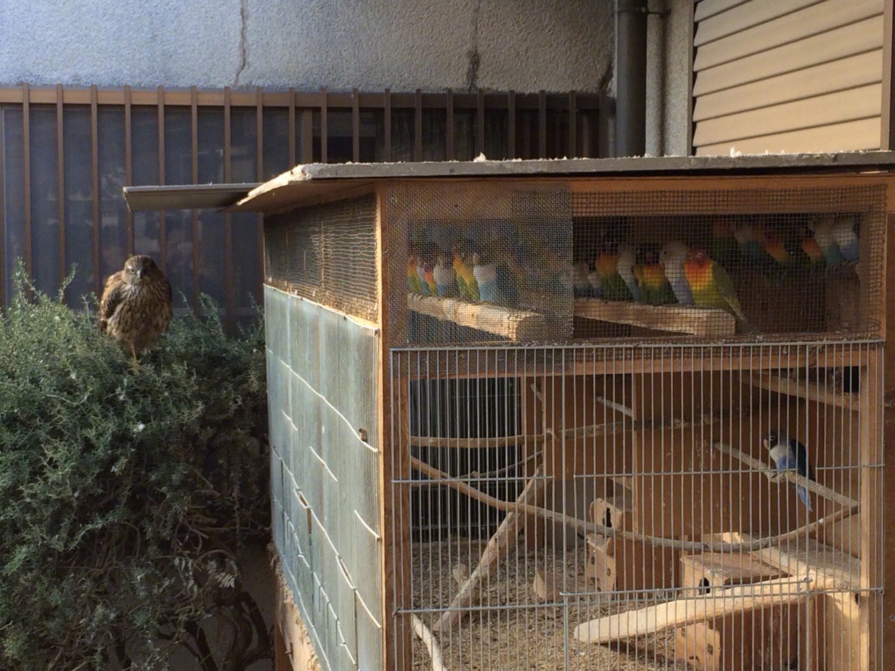 岛国一主人今天惊讶地发现,后院里不知怎么来了一只野鹰,自家养的鹦鹉吓得乖乖站成一排,整整齐齐...仿佛迎接领导视察