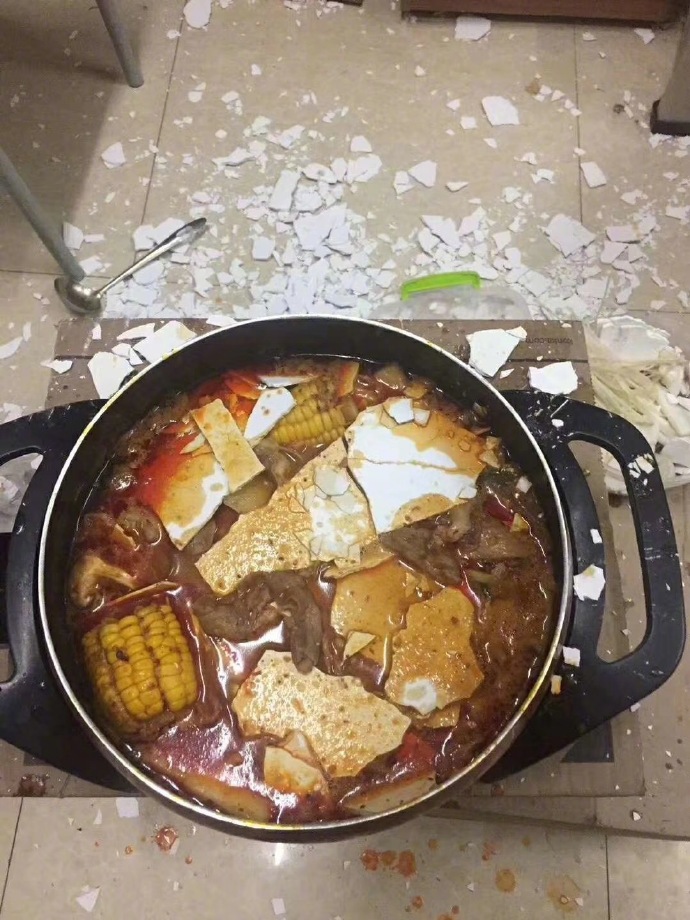 火锅还没来得及品尝,天花板掉墙皮,整个宿舍的人都崩溃了