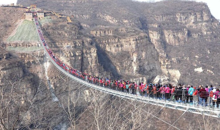 石家庄,平山红崖谷玻璃吊桥上挤满了游客,给我一百万也不想挤。