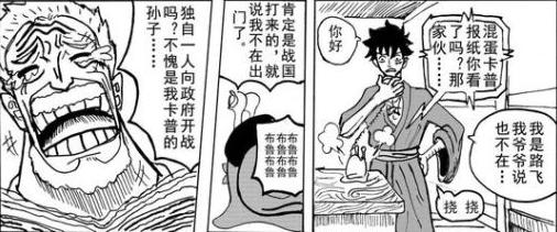路飞过来看他,正好战国打电话过来,卡普叫路飞去接说自己不在,路飞还报出自己的名字。