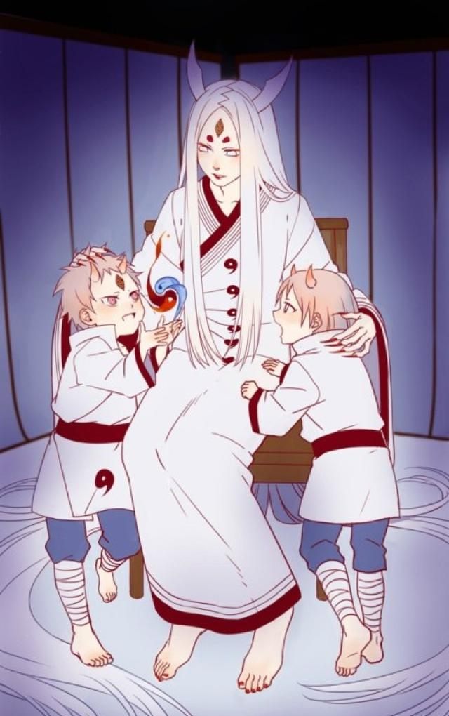 后来她生下了两个儿子,儿子长大后与她的意见不符,辉夜认为力量才是阻止战争的最好方式,而她的两个儿子觉得应当以爱感化人类。于是两个儿子为了世界一起打败了辉夜,将辉夜封印在月亮之中,而二儿子为了陪伴母亲,也去了月亮。大儿子则成了传说中的六道仙人。