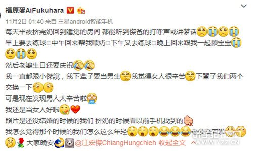 而且每天都会和福原爱错班,每天中午都要回家帮助福原爱喂奶,晚上打球了早早回去照顾宝宝。