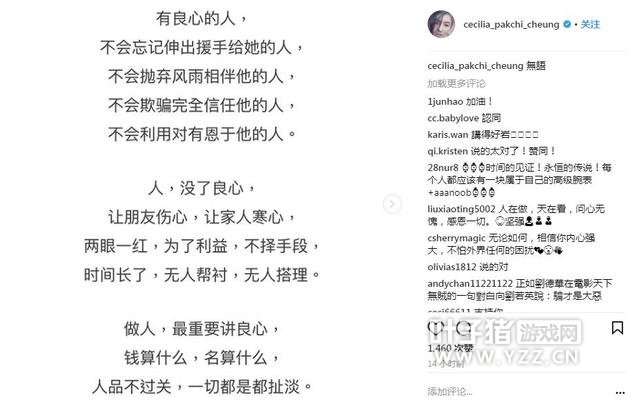 凤凰网娱乐讯 11月20日晚,张柏芝在社交网站上放出一段话,反复强调一定要做个有良心的人。并配上“无语”两字。张柏芝在这段话中,反复提到有良心的重要性。比如“人活着,钱不是第一,名不是第一,良心是第一。有良心的人,堂堂正正做人;有良心的人,正正经经做事。”