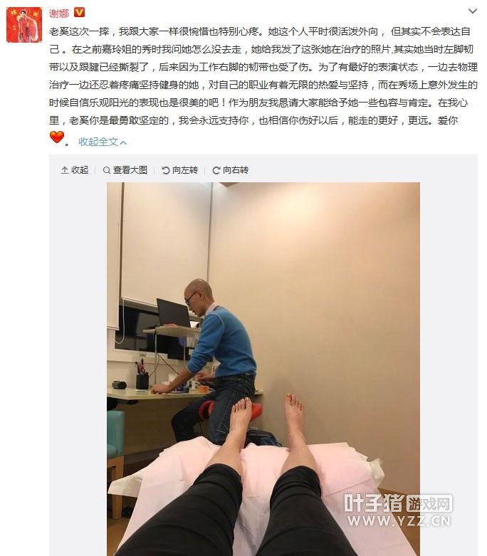 凤凰网娱乐讯 11月21日,谢娜发长文给好友奚梦瑶加油鼓励,还讲述了奚梦瑶“之前左脚韧带以及跟腱已经撕裂了,后来因为工作右脚的韧带也受了伤。为了有最好的表演状态,一边去物理治疗一边还忍着疼痛坚持健身的,对自己的职业有着无限的热爱与坚持”,大赞好友“自信乐观阳光”,最后还暖心表白“在我心里,老奚你是最勇敢坚定的,我会永远支持你,也相信你伤好以后,能走的更好,更远。爱你。”