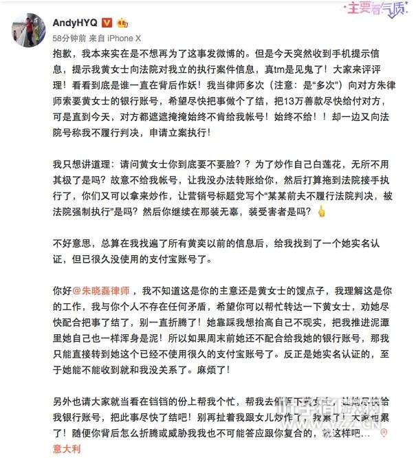 凤凰网娱乐讯 11月23日,黄毅清发布长文指责前妻黄奕两面三刀,一方面百般推脱不给自己转账账号,一方面又“向法院号称我不履行判决,申请立案执行”。