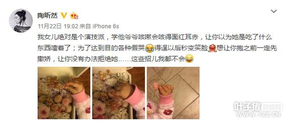 凤凰网娱乐讯 11月22日,演员陶昕然在社交平台分享出一组照片,和大家分享女儿的成长,感慨道:“我女儿绝对是个演技派,学他爷爷咳嗽会咳得面红耳赤,让你以为她是吃了什么东西噎着了;为了达到目的各种假哭,得逞以后秒变笑脸,想让你抱之前一定先撒娇,让你没有办法拒绝她……这些招儿我都不会”。都说会哭的孩子有奶吃,小何陶这情商也是赢在了起跑线上。