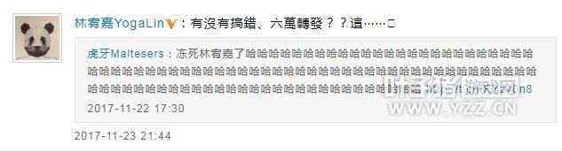 截至11月23日晚,该微博已转发六万,转发评论里清一色的“哈哈哈哈哈”令林宥嘉哭笑不得,他转发微博,并说道:“有没有搞错,六万转发??”