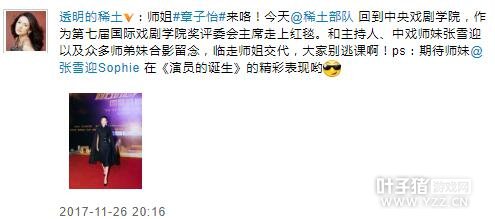 章子怡新闻发言官方微博配文:“今天章子怡回到中央戏剧学院,作为第七届国际戏剧学院奖评委会主席走上红毯。和主持人、中戏师妹张雪迎以及众多师弟妹合影留念,临走师姐交代,大家别逃课啊!ps:期待师妹张雪迎在《演员的诞生》的精彩表现哟”。