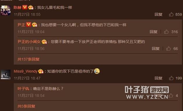 而陈赫也在下方做出评论:“我女儿的眉毛和我的一样”,尹正也表示:“想要一个女儿,但不想他和我一样的下巴。”