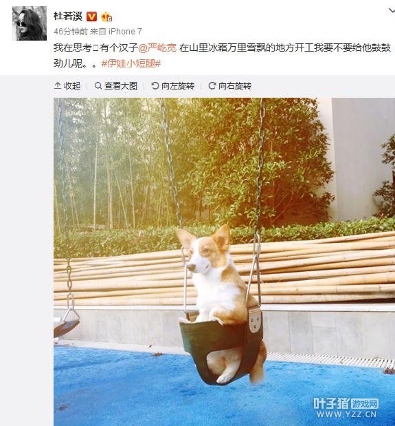 严屹宽与杜若溪甜蜜不已,惹的粉丝羡煞不已,配图却是一直狗坐在阳光明媚的公园秋千上的搞笑图片。