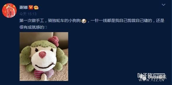 今日下午,娜姐在微博中晒出了一张照片,并配文:“第一次做手工,骑独轮车的小狗狗,一针一线都是我自己剪裁自己缝的,还是很有成就感的”。不得不说,谢娜也真是位心灵手巧,温柔细心的妈咪。宝宝还没有出来,就早早提前做好礼物欢迎她了,小娜娜真是太幸福啦!