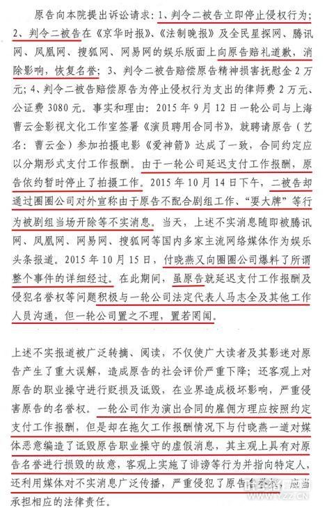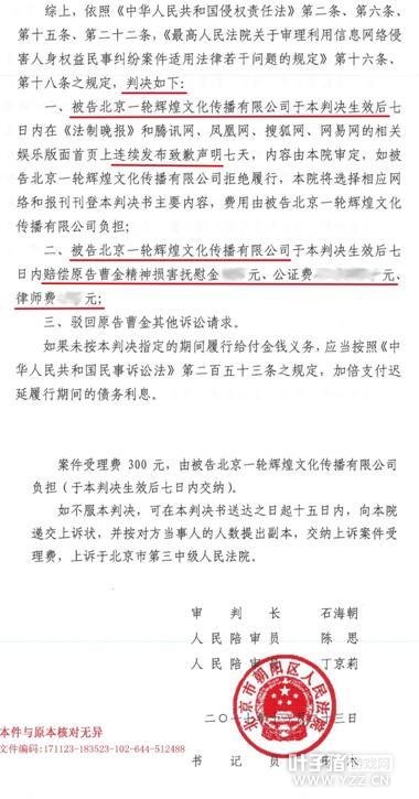 凤凰网娱乐讯 近日,北京市朝阳区人民法院发布民事判决书,对曹云金与电影《爱神箭》拍摄方一轮辉煌文化公司之间产生的名誉权纠纷,判决曹云金工作室胜诉,认定一轮辉煌文化公司代表马志全及其工作人员付晓燕对曹云金先生的名誉造成严重损害,责令被告对曹云金先生给予赔偿并公开道歉。