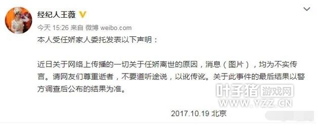 随后,经纪人王薇受任娇家人委托在微博上发表声明,称:“近日关于网络上传播的一切关于任娇离世的原因,消息(图片),均为不实传言。请网友们尊重逝者,不要道听途说,以讹传讹。关于此事件的最后结果以警方调查后公布的结果为准。”