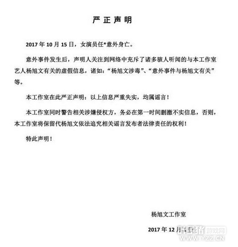 下午,杨旭文工作室发表声明,再度澄清谣言称:“2017年10月15日,女演员任*意外身亡。意外事件发生后,声明人关注到网络中充斥了诸多骇人听闻的与本工作室艺人杨旭文有关的虚假信息,诸如:‘杨旭文涉毒’、‘意外事件与杨旭文有关’等。本工作室在此严正声明:以上信息严重失实,均属谣言!”