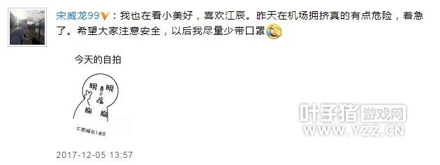 5日下午,宋威龙发博“表白”胡一天:“我也在看小美好,喜欢江辰”,并暖心地叮嘱粉丝注意安全:“希望大家注意安全,以后我尽量少带口罩”。宋威龙发微博自我调侃,机智地化解这一乌龙。