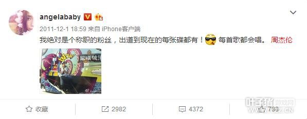 除了GD,baby的爱豆还有周杰伦,迷恋到什么程度呢?早在11年的时候就在微博上宣称自己拥有每一张周杰伦的专辑,甚至几乎能唱周杰伦所有的歌,这个说起来是很厉害了。