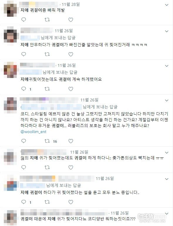 Lovelyz日前发行新专辑《Fall in Lovelyz》,因风格关系,此次服装清新中带点华丽,首饰也跟著变得较繁複,成员们几乎都戴上垂坠型的耳环,虽然看起来很合适,但11月26日举行签名会时,有称在现场的网友透露,成员智爱之前在舞台上“因为耳环把耳洞撕裂,所以流血了”。