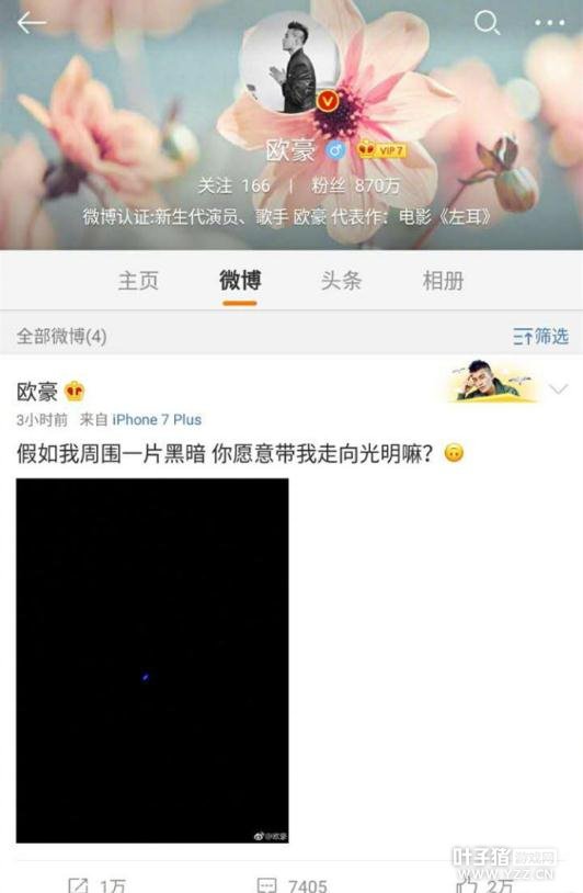 凤凰网娱乐讯 12月7日,有细心的网友发现,演员欧豪深夜疯狂删掉微博,仅剩4条。最近的一条是今晚发布的,微博写道:“假如我周围一片黑暗你愿意带我走向光明嘛?”