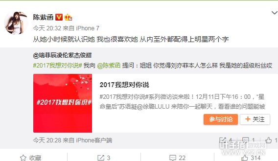 12月11日,陈紫函在微博和网友们互动,大赞刘亦菲是“由内而外配得上明星两个字。”还表示和陈浩民是好朋友。