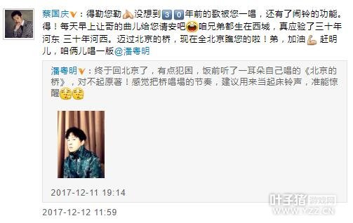 凤凰网娱乐讯 12月12日,潘粤明发文:“终于回北京了,有点犯困,饭前听了一耳朵自己唱的《北京的桥》,对不起原著!感觉把桥唱塌的节奏,建议用来当起床铃声,准能惊醒。”蔡国庆回复道:“得勒您勒,没想到30年前的歌被您一唱,还有了闹铃的功能。得!每天早上让哥的曲儿给您请安吧。”