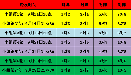 比赛时间: 小组循环积分赛 按照第26届天下第一比武大会,一共有8个小组,每个小组内服务器两两对阵。分组详细情况见服务器分组表情 四大级别排名定位赛 排名定位赛:每个小组1~2分在第一个级别(万夫莫开)、3~4分在第二个级别(横扫千军)、5~6分在第三个级别(百战功成)、7~8分在第四个级别(一马当先)。每个级别内按照帮战对阵规则,总共进行4场对决。 第1轮(10月12日20点): 每个级别内两两对阵 第2轮(10月14日20点): 8个组的胜利者对战,A:H,B:G,C:F,D:E,胜利者进入前4,失败者进入5-8名。 8个组的失败者对战,A:H,B:G,C:F,D:E,胜利者进入9-12,失败者进入13-16。 第3轮(10月19日20点): 1-4名的比赛:AH胜者:DE胜者,BG胜者:CF胜者。本轮比赛的的胜者进入冠亚军决赛,失败者进入3,4名决赛。 5-8名的比赛:AH负者:DE负者,BG负者:CF负者。本轮比赛的的胜者进入5,6名决赛,失败者进入7,8名决赛。 9-12名的比赛:AH胜者:DE胜者,BG胜者:CF胜者。本轮比赛的的胜者进入9,10名决赛,失败者进入11,12名决赛。 13-16名的比赛:AH负者:DE负者,BG负者:CF负者。本轮比赛的的胜者进入13,14名决赛,失败者进入15,16名决赛。 第4轮(10月26日20点): 分出1~16每个名次