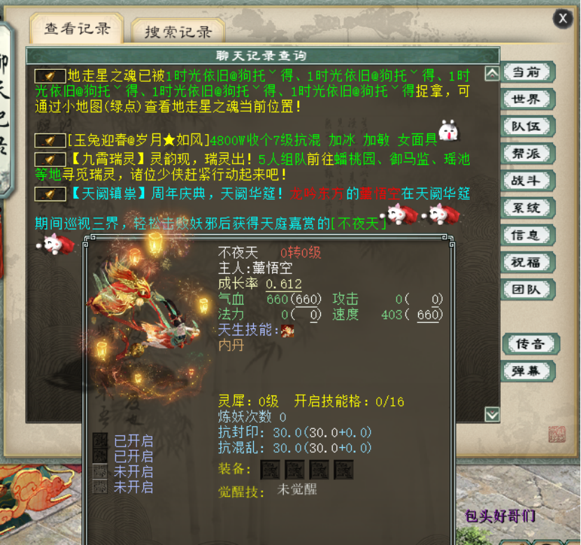 周年庆期间,七煞郎君账号被某回归大佬买走!秦人给自己的神兽蜘蛛修终极,一手爆发!这区的点卡竟然高达8万游戏币,想问下你们还好吗?花8.5万入手一条项链,值不值这个价?周年庆任务收获一只不夜天,今年的周年庆任务大家都得啥了? 兄弟们好!今天的大话新鲜事栏目准时奉上,一起来欣赏其中的精彩内容吧! 怀旧江湖,重归经典!大话2怀旧服火热回归中,想要冲怀旧新服的兄弟,别忘领取叶子猪专属礼包码,在游戏中激活即可获得超多道具奖励! 怀旧服至尊礼包码: DHXSMTYZZ 老友专属新服礼包(仅限2003新服): DHQYYZZ 一、回归大佬入手七煞郎君号! 周年庆之际,又又有神秘大佬回归了,他直接拿下曾经的第一男人“七煞郎君”的号,看来江湖又将迎来血雨腥风! 人物 子虚灵听 子虚点珠美人 这位大佬刚回归就改名“任缥缈”,并入手两只子虚神兽,总价值高达60万,有人说七煞老板从未离开,如今只是改名回归?兄弟们觉得到底是什么情况呢? 二、秦人修炼终极神兽蜘蛛! 秦人给自己的神兽蜘蛛修终极,结果一发入魂,世界为之震惊! 系统消息 蜘蛛全貌 这只神兽蜘蛛之前可没少修,近日终于修出化无,继夺得上届比武冠军之后,大佬最近又加大投资力度,小编也会持续打探! 三、某区点卡价格突破八万! 这区的点卡竟然高达8万游戏币,有点夸张啊,想问这区的兄弟你们还好吗? 点卡寄售价格 这比例应该是今年最高的了吧,有老铁知道这是哪个服务器吗,这区给召唤兽点灵犀是不是超划算? 四、花8.5万入手的项链! 某人以8.5万的价格,在藏宝阁入手了一条15级项链,咱们来看看值不值这个价! 项链全貌 十五级项链,底子灵性25、抗昏睡31.8,蓝字忽视抗混0.9,炼化忽视抗混4、抗灵宝伤害5、抗物理12、加强混3,总忽视混4.9,炼化非常完美,怪不得这么贵...... 五、周年庆任务喜得神兽! 周年庆任务刚刚开启,这位老铁就收获一只新版神兽“不夜天”,今年的周年庆没白过,恭喜老铁! 系统消息 来自龙吟东方服务器的老铁收获一只不夜天,果然好东西都是别人的,小编连个补天都没得到,表哥求几率啊!今年的周年庆任务大家都得啥了,一起来讨论讨论吧! 今天的大话新鲜事就到这里了,感谢赵公子、缚心、等等我、再见&单纯...、san 了个晒等玩家们的热心投稿,小伙伴们如果在游戏内外碰见任何有意思的事情,都可以给我们投稿哦! |