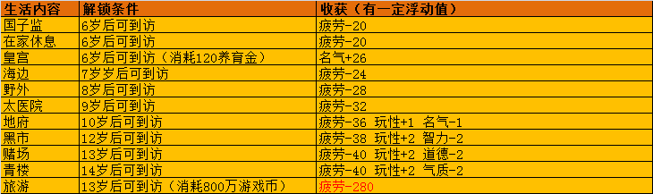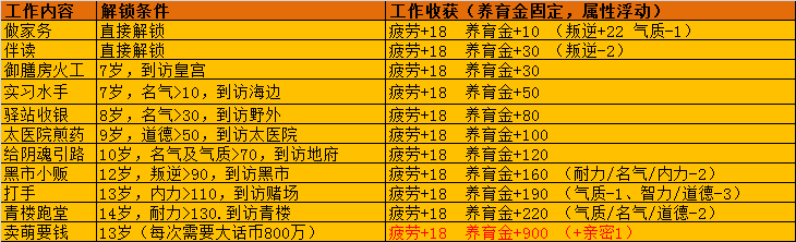 二、老版孩子重养 对于老版孩子的重养,就比较麻烦了,因为初始养育金不同,每个孩子的养育攻略都不一样,以下的介绍仅作从参考,要理解精髓,不要生套硬搬,也欢迎朋友们在养育的过程中联系我一同探讨。 6-7岁:和新版孩子的养法一样。 7-8岁:和新版孩子的养法一样。但是:去海边休息时遇到乞丐就给钱,以后在别的场景遇到乞丐也要给钱,老版孩子都是含着金钥匙出生的,花钱就是这么任性,但是,要确保剩余的钱足够完成本年龄段的学习、皇宫任务。如果初始养育金较多的话(至少6000以上吧),建议不要做实习水手,这次操作去做家务,省出来的次数以后用到给阴魂引路、学习、休息上。 8-9岁:和新版孩子的养法一样。但是:去野外休息时遇到乞丐就给钱,同时要确保剩余的钱足够完成本年龄段的学习、皇宫任务。如果初始养育金较多的话(至少7500以上吧),建议不要做或者少做驿站收银,这些操作去做家务或者皇宫,省出来的次数以后用到给阴魂引路、学习、休息上。 9-10岁:做家务做到叛逆达到1170+为止,剩余的次数参照新版孩子的养法,在煎药、太医院、皇宫、音律间灵活调整。如果在9岁初有较多的养育金,可以不做或少做煎药,这些操作可以去学习音律。 10-11岁:参照新版孩子的养法,在这个年龄段把名气做到1000左右,剩下的次数在音律、引路、地府间灵活调整即可。 11-12岁:参照新版孩子的养法,在这个年龄段首先把音律累计学到21次,剩下的次数就去引路和地府,就是去赚钱,为下一岁遇到乞丐的时候有钱给,但是岁末的时候剩余的钱不要太多,1500-2200为宜。 12-13岁:参照新版孩子的养法,在这个年龄段把音律学满30次,在黑市遇到乞丐就给钱,钱不多的时候就算先不学武术也要给乞丐。 13-18岁:好了,开启傻瓜模式,参照新版孩子的养法,把低级学习依次学满30次,然后开始高级学习,视情况安排皇宫休息。最终确保穿上装备在结局时,叛逆搞到1200点,名气搞到1000点,其他4项确保每项1000点,并且尽量将更多的属性项搞到或者接近1200点,如果还有余力,就把名气也搞到或者接近1200点。 小结: 无论是什么孩子,想要追求更高的评价,那就要在穿上装备、满足神结局要求的情况下,追求更多的属性项达到1200,追求总属性点更高。可是,孩子养育的操作次数就这么多,能不能提高属性点,秘密就在于怎么样减少休息(除皇宫)、工作(除家务)的次数,怎么样增加学习、做家务、皇宫的次数,掌握了这个原则,灵活运用,孩子就能最大限度的超神。 还有一点要特别注意的是,在培养前准备一套三级的孩子装备,什么属性都无所谓好坏(新版孩子的装备最好不要有道德),培养的时候穿在身上,务必确保各项属性穿上装备的情况下不要超过1200,如果超过,就减少对应的培养操作次数,增加属性点较少的培养操作。 结局后,打工最好去做给阴魂引路,因为引路是不减属性点的工作里给养育金最高的,当然,土豪也可以选择去卖萌;休息最好是去太医院,因为太医院是不减属性点的休息里减疲劳最多的,同样,土豪也可以选择去旅游。 孩子结局后,除叛逆外,其他各项属性还可以继续追加,道德追加的最快,其次是名气,再次是其他属性。给阴魂引路3次得360养育金和54点疲劳,野外休息2次减56点疲劳,遇乞丐一次给360的养育金,得3点道德,每追加1点道德需要1.67次操作;给阴魂引路16次得1920养育金和288点疲劳,太医院休息9次减288点疲劳,去皇宫16次减少1920养育金得16点名气,每追加1点名气需要2.56次操作;给阴魂引路8次得960养育金和144点疲劳,学习8次减少960养育金、增加144点疲劳、得8点属性,太医院休息9次减288点疲劳,每追加1点属性需要3.13次操作。 其他问题在网上的攻略里都有详细介绍,我就不赘述了。切记:任何攻略都只是个参考,要根据自己的培养情况做一些必要的微调。 (叶子猪游戏网 作者:慕、紫云凌霄 服务器:烟雨斜阳) <<<点击进入大话西游2论坛讨论>>> |