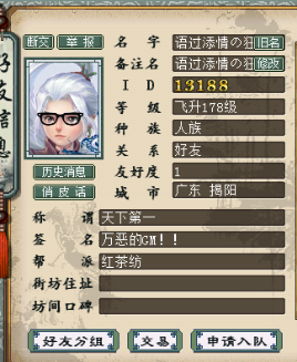 感谢大家关注叶子猪《兄弟你在哪》系列,此单元为招队友,找队友单元。(近期有不法人员冒充找队友行骗,请大家不要轻信) 如果你空一身好宝宝好装备,却没有的队友跟兄弟,那就来仙侣奇缘吧,添情队伍不会令你失望!接下来让我们来看看添情队伍需要招募什么队友!联系小编找队友/招队友:Q252332183(富江) 服务器:仙侣奇缘 招收要求:5破大力鬼 3---5个化无绝境多点的可以持续投资的。欢迎不易清号的,帮战,水路必到,喜欢PK人品好的玩家。 联系方式: 游戏ID:13188 采访内容: 叶子猪记者:添情你好,我是叶子猪记者W。 添情:你好! 叶子猪记者:祝贺你夺得第26届甲级比武大会冠军啊! 添情:谢谢。 叶子猪记者:听说你需要招募队友,请问需要招募什么角色的呢? 添情:5级神兵破的大力鬼,毕竟不是人人都有6破。还有3--5个化无绝境多点,物资跟我们差不多就好了,脾气好的能经常来的,别的没什么要求了。 叶子猪记者:好的,我帮你拿小本子记下来。你们队伍组建了多久了呢? 添情:有三个已经在一起玩了10年了。 叶子猪记者:哇,看来都是老玩家了啊,那默契肯定十分的好吧? 添情:还可以吧。 叶子猪记者:你们队伍里谁是指挥谁是队长呢? 添情:1213是队长,指挥是我。 叶子猪记者:好的,你招募队友的要求我都帮你记好了。为了让未来的队友了解下队伍的物资,可以发一些物资出来吗? 添情:可以的。 叶子猪记者:嗯,非常感谢您能接受我们的采访,同时也希望您能多多关注叶子猪。 添情:会的,谢谢你们。 以下是队伍部分物资展示: