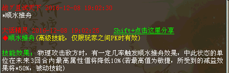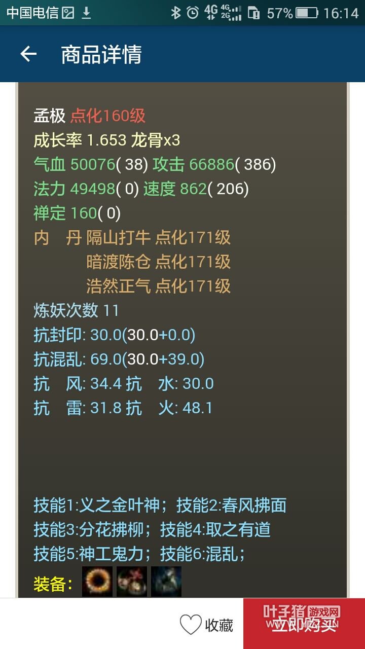 如果是还没有买孟极的,推荐买成品6开的,因为自己开格子的机率小,5开都已经很难,有些很高级了还是铁蛋,6开的一般在3000左右,好点技能或变色的会更贵。下面这只孟极本来打算点来的,3300块加跨服3630,由于朋友们说贵了,后面每天一直降价,降到2900的时候,我还以为还会降,于是再等,没想到他改回2950了,我以为还会改回2900,于是等待,居然2950被人点了。后悔啊!见下图: 义金+分花拂柳+春风拂面+取之有道+混乱+神工鬼力(标价4200) 顺水推舟这个技能也是Pk很好用的,如果孟极领悟到了可以带上战场,触发后,效果还是挺好的,如果砍到30万血的男鬼触发后,在未来3回合内,鬼的血会降到27万。如果是砍到男魔,3000敏的男魔,在未来3回合内会降敏到2850,这个技能的描述是这样的,如下图: 这个孟极不错吧