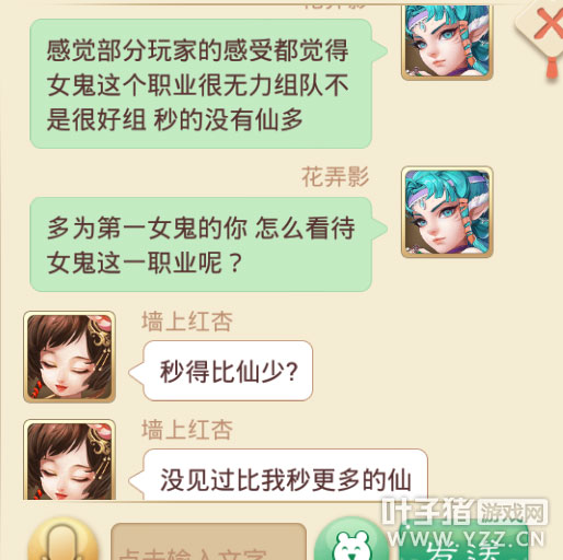 【本心得原创于叶子猪论坛,作者:三围吓死你 ,转载请注明来源】 今天看到很多玩家讨论说女鬼太无力了,二测时候要换职业了?这不免让花花想起来曾经的女人!可是看看女人杀星多给力呀?那么今天花花就带大家来看看女鬼的优点在哪里! 首先我们都知道女鬼的3个技能 鬼火(伤害) 遗忘(控制) 魅惑(减抗) 首先花花个人觉得鬼女从技能来看还是蛮全面的!可以一说是人魔仙的结合!可是根据调查女鬼经常找不到队伍的原因在哪里呢? 下面让我们一起来看全区第一女鬼的看法! 以下是花花与全区第一女鬼的对话全过程,最近花花身体有些不舒服就不做记录了直接看图吧~呼呼 花花:你好,我是花花,花弄影,想简单的问你几个关于女鬼的问题可以吗? 墙上红杏:嗯,好的。 花花:部分玩家都感觉女鬼这个职业很无力,不是很好组队,秒得都没有仙多,作为第一女鬼的你,怎么看待女鬼这个职业的呢? 墙上红杏:秒得比仙少?我还没见过秒得比我多得仙。 花花:谈谈你对女鬼的心得吧? 墙上红杏:队伍需要,我们很早杀7星了,8星不好杀,就转男女人队伍了,然后我转个女鬼,他们控制更稳,于是9星也过了。 花花:内测就要删档了,能在删档前给我们玩女鬼的小伙伴提一点建议吗? 墙上红杏:和队伍其他成员控制好速度,可以敏魅惑后队友甩冰,也可以中敏女鬼,敏冰后再魅惑。至于秒,我推荐先魅惑好让人族稳稳控制后再开始。 花花:非常的感谢我们第一女鬼提供的数据和心得,感谢接受花花的才发,祝您游戏愉快。那么在删档最后,可以用一句话送给想玩女鬼的玩家还有叶子猪吗? 墙上红杏:爱大话女鬼会有一片天,叶子猪专业的游戏网站。 以上是花花与全区第一女鬼的对话过程,整个过程当初花花听到了他玩女鬼的专业和自信!与队友的配合是很关键的,女鬼的魅惑会为队员带来成吨的输出伤害,想必这就是女鬼的成就感吧! 当下女鬼作为比较冷门的职业不代表女鬼不够强大,其实小伙伴们不要太主流,要有自己的选择性,都说魔族是万金油,都跑去玩魔族了,眼看这个魔族都要成灾了,在一个魔族漫天的年代作为一个魔族你会组到队伍吗? 下面是全区第一女鬼的装备一览! 最后删档在即二测即将开启,希望大家在二测的时候都可以认真的去选择自己喜欢的职业! 只要你坚持,相信一定可以看到女鬼的精彩,她就像一颗钻石你给他怎样的光,她给你怎样的彩! 还是那句老话 成功的路上并不拥挤,因为坚持的人不多! 伙伴们~加油~希望女鬼的小伙伴们 现在你们找到自信了吗? 加油哦~! 二测开启 花花与大家不见不散! ▌关于游戏: 大话西游同名手游在玩法上继承了端游的经典玩法。诸如婚姻、家园、庭院、结义、PK、帮战、联赛、皇宫、五环、杀星、挖宝、做天、修罗、地宫、杀塔等大话2玩家所熟知的要素都将在针对智能手机特性优化后加入。而最受大话2玩家喜爱的情义社交体系,如帮派、结义、师徒婚姻系统等也将移植到手游版上。 2015,大话西游同名手游,话回青春,不见不散。 2015,大话西游同名手游,让我们静待这一次的青春到来。 大话西游手游官网:http://xy2.yzz.cn/sy/ 大话西游手游下载:http://www.yzz.cn/ku/dhxy/ 大话手游微信订阅号:dhxy2shouyou 【叶子猪手游通大话手游微信订阅号】 关注叶子猪游通大话手游微信订阅号,我们即将举办《大话西游手游》激活码活动。 手机扫描微信订阅号二维码: 【叶子猪手游通大话手游Q群发码活动】 进入Q群,Q群将会内举办发码活动,越活跃得码机会越大。 群号:213794076