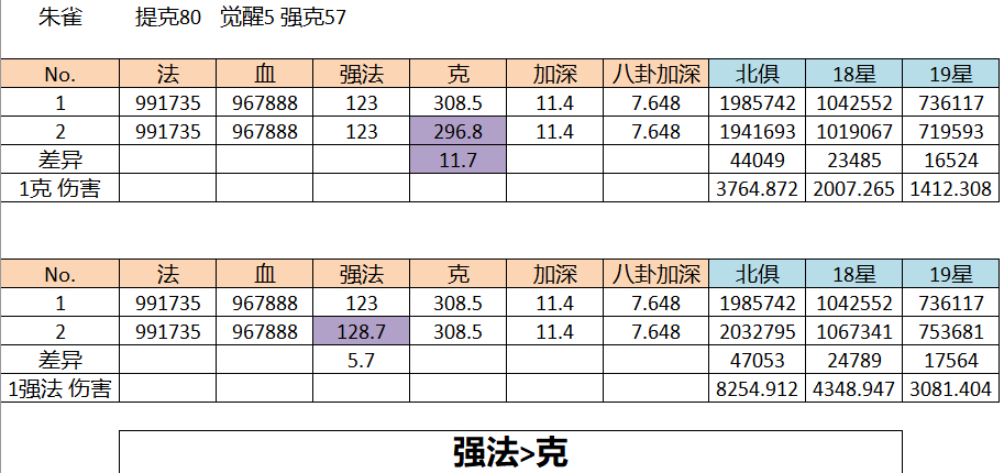 大话手游神族选克还是强法好?有一玩家好奇到底哪个好,哪个收益更高,于是他进行了一组对比数据测试: 目前戒指克还未完善,还有待提升,具体神族伤害算法我不会,此贴只比较2点 1. 同强法调整克,北俱 18星 19星 伤害 2. 同克调整强法,北俱 18星 19星 伤害 先附上属性细节明细,再看实战图: 调整克 北俱 调整克 18星 调整克 19星 调整 强法 克不变 北俱 调整 强法 克不变 18星 调整 强法 克不变 19星 最后附上 变身+神恩 19 伤害 差不多2.15倍,也就是说,1强法=2点克?大家觉得这个结论正确吗? |