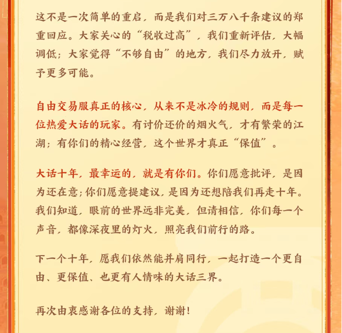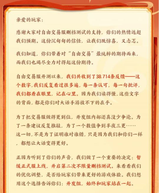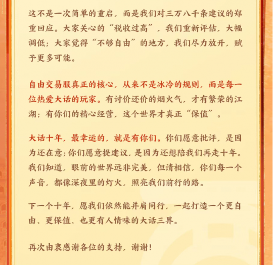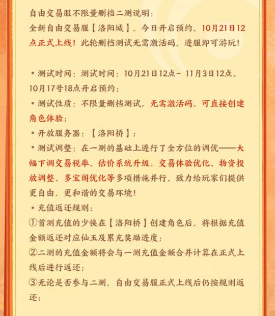 大话西游手游自由交易服暂缓正式服上线,开启第二次不限量删档测试,在一测的基础上进行了全方位的调优——大幅下调交易税率、估价系统升级、交易体验优化、物资投放调整、多宝阁优化等多项措施并行,致力给玩家们提供更自由,更和谐的交易环境!
