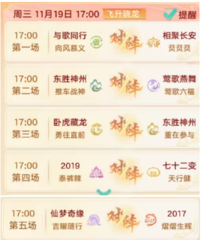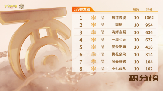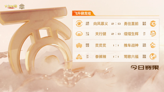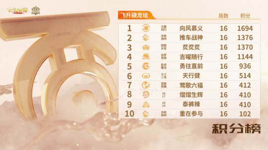 运筹帷幄定乾坤,笑傲江湖破万军!群雄巅峰赛S10于昨天(11月16日)完成了第二周常规赛,179惊龙组、飞升骁龙组的少侠在昨天的对战中表现出了傲然风采,不负三界威名! 风采卓然 179惊龙组威名远扬 179惊龙组昨日(11月16日)的对战,由『乐逍遥』服务器【南征】对阵【我爱吃肉】,【桃花朵朵】对阵【闲云野鹤】、【清辉夜凝】对阵【小七战队】,【风清云淡】对阵【一周七天】。 截至目前,179惊龙组群雄巅峰赛S10总积分如下图所示: 179惊龙组群雄巅峰赛S10昨日(11月16日)赛果 战江湖,一战倾城!179惊龙组的少侠在昨日的对战当中,以破竹之势力战群雄,不仅在赛事中留下了绚丽的一笔,更是打出了威震八方的豪侠之名! 纵横睥睨 飞升骁龙组名不虚传 飞升骁龙组昨日(11月16日)的对阵,由『与歌同行』服务器【向风慕义】对阵『卧虎藏龙』服务器【勇往直前】,『七十二变』服务器【天行健】对阵『2017』服务器【熠熠生辉】,『相聚长安』服务器【烎烎烎】对阵『东胜神州』服务器【推车战神】,『2019』服务器【泰裤辣】对阵『莺歌燕舞』服务器【莺歌六福】。 截至目前,飞升骁龙组群雄巅峰赛S10总积分如下图所示: 飞升骁龙组群雄巅峰赛S10昨日(11月16日)赛果 风云变,天地惊!飞升骁龙组的少侠在对战中气势如虹,高手与高手之间的快意激战,彰显出属于巅峰赛事的从容与霸气! 至此,群雄巅峰赛S10常规赛第二周的赛事圆满结束,下周三(11月19日)起,将开启群雄巅峰赛S10常规赛第三周的精彩对决,敬请期待! 11月19日 常规赛第三周即将打响 群雄巅峰赛S10第三周常规赛,也就是最后一周赛事,将于11月19日至11月23日期间火热开幕,飞升骁龙组将在11月19日为大家送上激情对战! 11月19日17:00,飞升骁龙组将由『与歌同行』服务器【向风慕义】对阵『相聚长安』服务器【烎烎烎】,『东胜神州』服务器【推车战神】对阵『莺歌燕』舞服务器【莺歌六福】,『卧虎藏龙』服务器【勇往直前】对阵『东胜神州』服务器【重在参与】,『2019』服务器【泰裤辣】对阵『七十二变』服务器【天行健】,『仙梦奇缘』服务器【吉曜随行】对阵『2017』服务器【熠熠生辉】。 群雄巅峰赛S10飞升骁龙组11月19日赛程 11月19日,群雄巅峰赛S10常规赛第三周赛事震撼开启,期待所有参赛战队在对战中的精彩表现!届时,在游戏内观赛,还有机会赢取高级藏宝图、龙之骨等丰厚好礼,记得喊上兄弟一起观赛! |