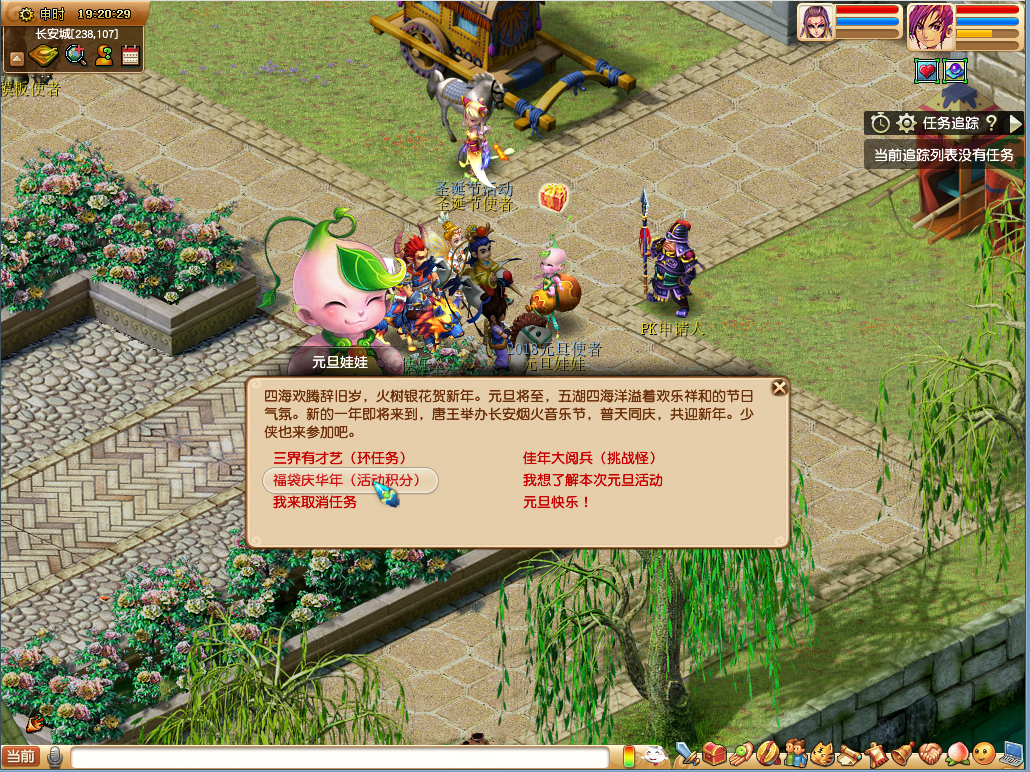| 第1页--回顶部 2018年元旦活动简介:四海欢腾辞旧岁,火树银花贺新年! 活动时间:2017年12月30日12:00-2018年1月3日12:00 2018年元旦活动简介 活动时间 2017年12月30日12:00至2018年1月3日12:00 领取要求 等级≥30级,队伍人数≥3人 玩法介绍 四海升平,万国来朝,一年一度的长安烟火音乐会也即将举行。今年唐王希望从三界中招募有特殊才艺的人士,以扭转近些年来千篇一律的情况。少侠将化身选秀导师,为一年一度的长安烟火音乐会选取才艺人士的精彩表演,让繁华的长安万众瞩目,异彩纷呈。 活动期间,玩家可以在长安城(240,110)元旦娃娃处选择“三界有才艺(环任务)”领取组队环任务,按照提示完成任务,就可以获得丰厚的经验、金钱和随机元旦积分奖励。队长每次成功带队完成一轮环任务时,均会获得额外的元旦积分奖励。 特别说明 1、任务不受双倍、精修时间影响,死亡计算为非正常死亡,原地复活无损失;若使用800*600、1024*768分辨率、全屏客户端或互通版参与活动,则经验、金钱、积分奖励和获得物品概率都将提升10%。 2、任务时限40分钟,可以在元旦娃娃处取消任务,取消任务3分钟内不能再次领取任务。 3、领取式任务10环为一轮。每天前80环为双倍奖励,81至140环为1.4倍奖励,141环及以后无任何奖励。 4、完成前80环任务可获得随机元旦积分,可以在元旦娃娃处使用积分兑换随机福袋。 5、元旦娃娃回收时间:2018年1月16日08:00。 佳年大阅兵 活动时间 2017年12月30日12:00至2018年1月3日12:00 领取要求 等级≥50级,队伍人数≥5人 玩法介绍 新年伊始,万象更新,唐王在阅兵场组织了一场规模盛大的阅兵仪式,彰显大唐国力昌盛。少侠需要用自己的实力,来检验战士们的能力! 活动期间,玩家可以在长安城(240,110)元旦娃娃处选择“佳年大阅兵(挑战怪)”选项,前往演兵场,与来自东海,地府和大唐的侠士进行切磋。挑战玩法共分“普通”和“困难”两个难度,每个难度下每天均可以获得1次奖励,但挑战次数不限。在所有队员完成当前选定难度的所有挑战之前,不可以开启下一难度的任何怪物的挑战。挑战成功可以获得丰厚的经验、金钱和随机元旦积分奖励。 特别说明 1、任务不受双倍、精修时间影响,死亡计算为非正常死亡,原地复活无损失;若使用800*600、1024*768分辨率、全屏客户端或互通版参与活动,则经验、金钱、积分奖励和获得物品概率都将提升10%。 2、完成任务可获得随机元旦积分,可以在元旦娃娃处使用积分兑换随机福袋。 3、元旦娃娃回收时间:2018年1月16日08:00。 福袋庆华年 活动时间 2017年12月30日12:00至2018年1月3日12:00 领取要求 等级≥10级,单人 玩法介绍 元旦佳节到,三界同庆,共迎新年。元旦娃娃也带来了珍贵的福袋礼物,玩家(≥10级)可以通过元旦积分在元旦娃娃那兑换随机福袋(银丝福袋,鎏金福袋,蟠龙福袋),打开福袋可以获得丰厚的物品奖励,还等什么呢!同时,三种福袋还可以进行摆摊交易,尝试和大家一块分享节日的喜悦吧! 特别说明 任务不受双倍、精修时间影响。 新年心愿成 活动时间 2017年12月30日12:00至2018年1月3日12:00 领取要求 等级≥30级,单人 玩法介绍 新年伊始,天降祥瑞,每天0:00到23:59分的每个整点,在江南野外,建邺城,东海湾,宝象国,西梁女国将随机降下许愿树,许愿树将在一定的时间内开花结果,玩家(≥30级)可以前往采撷,获得丰厚的金钱,经验,随机元旦积分奖励。 特别说明 任务不受双倍、精修时间影响;若使用800*600、1024*768分辨率、全屏客户端或互通版参与活动,则经验、金钱、积分奖励和获得物品概率都将提升10%。 烟火迎新春 活动时间 2017年12月31日23:45至2018年1月1日00:45 领取要求 等级≥10级,单人 玩法介绍 2017年12月31日23:45至2018年1月1日00:15期间,玩家(≥10级)在长安城、宝象国、朱紫国、西梁女国和大家一起庆贺新年,每3分钟就可以获得一次经验奖励。 同时,在这些地方将会降下许多烟花,点燃这些烟花可以获得经验奖励。 大家一起来点燃烟花,迎接新的一年吧! 特别说明 任务不受双倍、精修时间影响;若使用800*600、1024*768分辨率、全屏客户端或互通版参与活动,则经验、金钱、积分奖励和获得物品概率都将提升10%。 幻境贺新年 每日签到 活动时间 2017年12月30日00:00至2018年1月3日24:00 活动规则 活动期间,每天登陆口袋版即可前往“日常登陆”中领取登陆奖励以及一个“辞旧迎新”葫芦。打开葫芦一定获得经验及储备金,并有机会额外获得物品奖励。 雪人贺岁 新年来到,口袋幻境飘来一片奇幻雪花。据说这些雪花充满着灵气,用这种奇雪堆出奇妙雪人将会获得神秘祝福。 活动时间 2017年12月30日12:00至2018年1月3日12:00 活动规则 活动期间,可以消耗精力获取具有灵气值的雪块,参与堆雪人游戏,获得丰厚奖励。 每个雪块(球)右下角都有一个数字,代表其灵气值。 向上下左右四个方向滑动,所有方块内的雪球都会向滑动方向靠拢,并在空白位置产生一个新的数字。 每次滑动,相同灵气值的雪块(球)将会叠加,形成更高灵气值。 随着灵气值的变化,将会呈现不同的状态,不同灵气值的雪球可以兑换不同奖励。 特殊说明 1.每天最多可以购买3000个灵气值为2的雪块。 2.活动结束后,将会保留奖励至2017年1月9日12:00,逾期系统将会自动兑换全部奖励。 福袋迎春 活动时间 2017年12月30日12:00至2018年1月3日12:00 活动简介 元旦娃娃携福袋来到口袋幻境,各位玩家若是