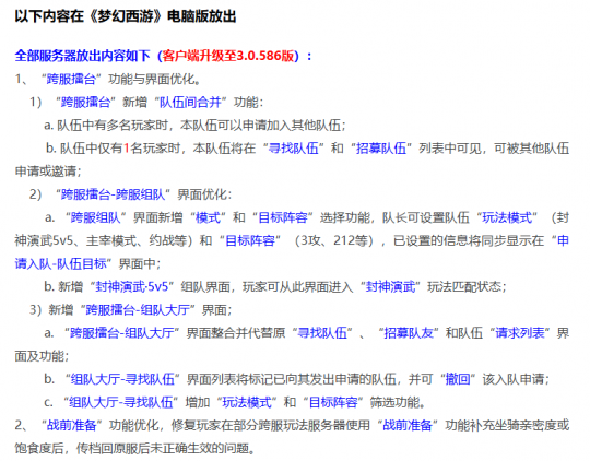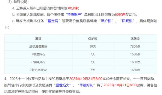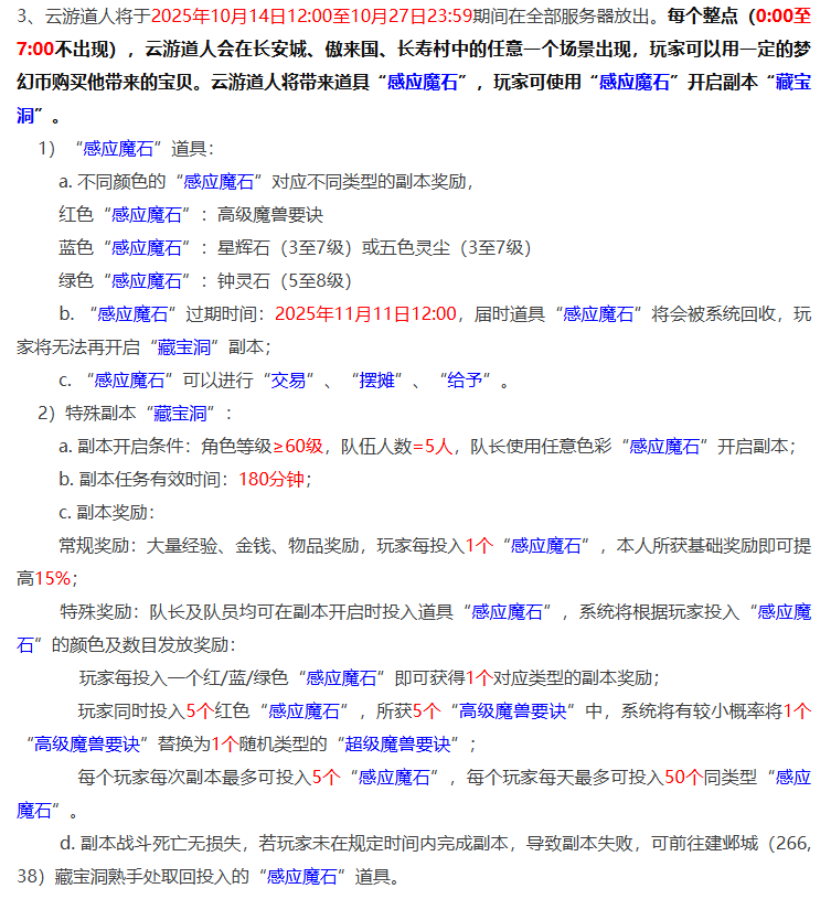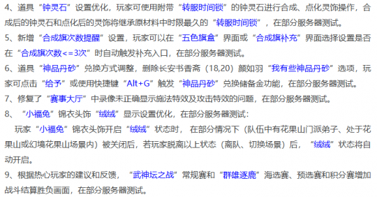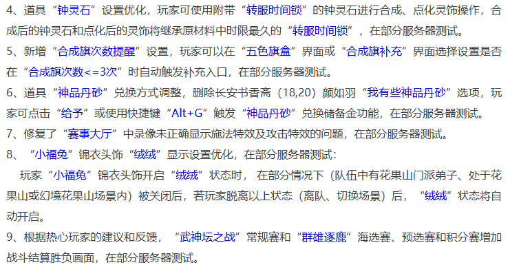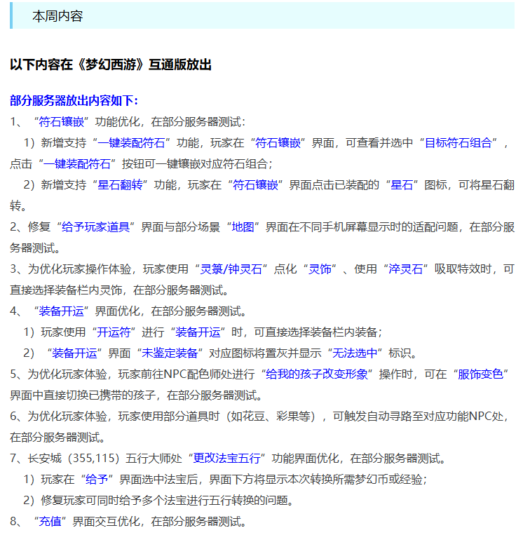 本周梦幻西游十月大改如期而至,除此之外,云游道人也再次降临,每次道人来了之后,变化最大的就是金价,各个服务器金价都会上涨不少,而物价也会随着道人到来而下跌,一起来看看本周具体维护情况吧。 首先是本周互通版的一些功能优化,符石镶嵌功能优化,玩家可以一键配装符石,互通版操作更简便化。修复给予玩家道具界面与部分场景地图界面在不同手机屏幕显示时的适配问题。灵箓/钟灵石点化和吸取时可以直接在装备栏进行,不需要脱掉装备。装备开运界面优化。孩子改变形象操作可在服饰变色界面中直接切换已携带的孩子。法宝更改五行界面优化。充值界面交互功能优化。 电脑版全服放出内容有:跨服擂台功能与界面优化,新增加队伍间合并功能,跨服擂台组队界面优化,以及新增加了跨服擂台组队大厅。战前准备功能优化,修复部分跨服玩法战前准备功能补充坐骑亲密度、饱和度后,传档回原服后未正确生效问题。 云游道人来袭,云游道人玩法还是之前的感应魔石道具,分红色、蓝色、绿色三种,红色感应魔石是高兽决,蓝色感应魔石是星辉石(3-7级)或五色灵尘(3-7级),绿色感应魔石是钟灵石(5-8级),主打一个看脸玩法。另外,红色感应魔石同时投入5个,系统有较小概率将1个高兽决替换为1个超级兽决,出一本超级兽决直接逆袭了。云游道人期间特殊账户单日取出上限调整为60亿游戏币。 十一中秋活动NPC将在21日离开,大家记得道具使用以及积分兑换。 最后是测试服的一些改动情况:小地图界面新增加查看摊位位置与显示组队地点功能,方便进区体验。仓库界面增加仓库搜索,以快速跳转仓库物品摆放点。新增加“行动条”功能,优化战斗体验,目前仅在帮派竞赛、英雄大会、皇宫决斗、正常决斗中生效。 钟灵石设置优化,可以使用附带转服时间锁的钟灵石进行合成、点化灵饰操作,使用后继承材料的时间锁。合成旗次数提醒设置,可以自动补充。神品丹砂兑换方式调整。修复赛事大厅中录像未正确显示施法特效及攻击特效的问题。小福兔锦衣头饰绒绒显示设置优化。武神坛之战常规赛和群雄逐鹿海选赛、预选赛和积分赛增加战斗结束胜负画面。 特别说明,十月大改将在15日中午12点开始测试,≥159级角色可以申请报名测试。 好了,本期的内容到此就结束了,喜欢表弟的记得赞。 编辑:百晓生