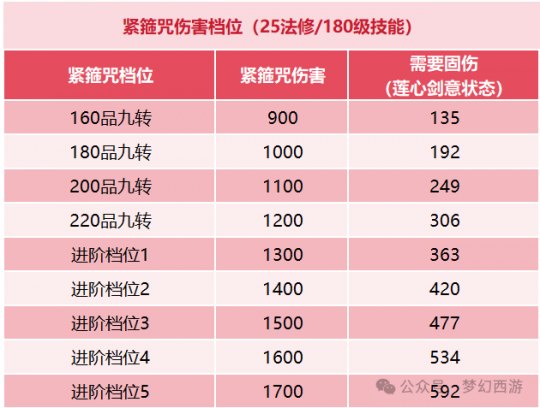 从奇袭时代降临后,咒师普陀在各大赛场越来越流行。 最近有很多玩家给小美留言:“想尝试咒师阵容,但是没有6固伤前排灵饰,只能望梅止渴了,好难过”。 小美见不得你们难过!咱就说,其实玩咒师并不是“非6固伤前排灵饰不可”。只要掌握好固伤数值,让实战中的紧箍咒伤害达到合格的“档位”,就可以成为一个合格的咒师。 【固伤的档位】 那么,“紧箍咒的伤害档位”要如何判定呢?道理非常简单,咱们举例说明。 以帮派联赛为例,帮派联赛使用的药品品质为160,此时,九转回魂丹复活目标的血量为900(不考虑治疗灵饰)。那么,针对帮派联赛而言,咱们的紧箍咒伤害只要达到900以上,就可以轻松“守尸”。 同理,如果咱们征战的赛场是群雄逐鹿,群雄逐鹿的默认药品品质为200,此时,九转回魂丹复活目标的血量为1100(不考虑治疗灵饰)。那么,针对群雄逐鹿而言,咱们的紧箍咒伤害就需要达到1100以上才能实现“守尸”的效果。 【紧箍咒和固伤的关系】 了解完“紧箍咒的伤害档位”,下面,咱们来了解了解紧箍咒和固伤的关系。 紧箍咒的伤害由基础伤害和固伤加成两部分组成。在没有任何经脉技能加成的情况下,紧箍咒的伤害为技能等级+10,学习经脉技能“默诵”之后,紧箍咒的基础伤害会翻倍,并且使紧箍咒受到固伤能力的影响。 另外,经脉技能“莲心剑意”会提升咱们(法术修炼*3%)的固伤,这个加成对紧箍咒的基础伤害也有效果。也就是说,25法修咒师开启莲心剑意后,紧箍咒的基础伤害会达到380*1.75=665。 接着,咱们说说紧箍咒的固伤加成,加成原理是非常简单的“1+1”。每1点固伤增加1点紧箍咒的实际伤害。并且,这些固伤也会受到莲心剑意的1.75倍加成(神木林临时符增加的法术伤害结果只作用于五行法术,对紧箍咒无效)。 下面是小美为大家整理的“紧箍咒伤害档位”具体数据以及所需要的固伤,对咒师有兴趣的玩家可以右键保存哦: 验证数据如下: 注意,观音咒技能符石可以增加6级紧箍咒技能等级,约21点紧箍咒伤害(不计算固伤符石加成)。咱们如果使用观音咒技能符石,可以额外降低最多12点固伤要求。 简单点说,咱们的咒师只是征战帮派联赛,主打半辅助半守尸的功能定位。那么,只需要利用任务使用的4固伤前排就能够轻松达到目的。 温馨提示:由于咒师同门对弈时,通常会使用普度众生辅助恢复。因此,咱们还需要计算普度众生的恢复量。 以175级咒师的普度众生为例,在开启莲心剑意状态(减少治疗效果10%)后,普度众生首回合恢复量为645(无治疗灵饰和法宝,衣服没有技能符石,无底洞临时符为74),第三回合后恢复量会衰减至499左右。那么,在帮派联赛赛场上,咱们想要精益求精的话,就需要让咱们的紧箍咒达到900+499=1399的伤害。 好啦,今天的推文就到这里,咱评论区不见不散哦。 编辑:百晓生