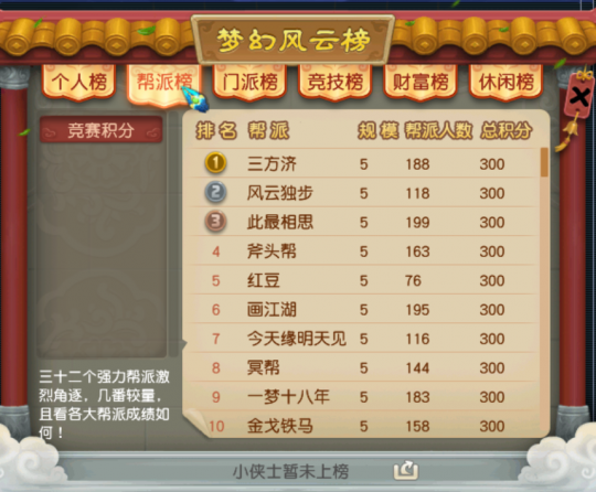 各位计划闯荡畅玩服,又不想去新区排队的少侠们,今天,我为大家推荐一个“排队用时少的同时区内很火爆”的服务器:【此最相思】。 【此最相思】是畅玩服第二波开启的服务器之一,只比“开山四服”晚几个小时。少侠们选择【此最相思】既可以体验畅玩服的快乐,又不需要经历“艰苦”的开荒期,非常适合主打休闲的少侠们。 下面,让我们一起走进【此最相思】,一起感受【此最相思】的繁华吧! 【日常经济】 首先是大家最关心的点卡价格,最近成交价为11085/点。 接下来是【此最相思】各种宝石的价格统计,图中的价格为宝石商人处售卖价格。 五宝及特赦令牌的收购价格,图中的价格选择了适中的收购价格。 部分低级魔兽要诀及宝宝内丹的收购价格,图中的价格选择了适中的收购价格。 各等级环装的售卖价格,依然是选择了适中的售卖价格进行展示。 最后是畅玩服各种师门烹饪、药品以及家具的售卖价格展示,目前,【此最相思】的烹饪以及三级药品因为品质的原因,价格波动很大。 【服务器发展】 现阶段,【此最相思】的服务器等级上限已开放至145级,我们先来看看十大高手以及各大门派的高手吧: 【十大高手】 注意哦,十大高手的排行标准为人物总经验,而不是现阶段的等级。 另外,除女儿村、天宫和狮驼岭之外,其他门派都已拥有145级满级弟子,这九大门派第一个满级的少侠如下: 其中,方寸山的吉吉暴少侠是【此最相思】第一个达到145级的玩家哦。 最后,让我们来看看【此最相思】的帮派发展情况。目前,【此最相思】现存帮派519个,其中,75个帮派已升级至5级帮,前十帮派排名(帮战成绩)如下: 【总结】 【此最相思】有一种低调繁华的感觉,区内竞争不算特别激烈,但商业氛围浓厚,经济发展趋势很好。而且,【此最相思】“人气高但不需要排队”的优势是其他服务器所不具备的,非常适合想体验畅玩服却不想“开荒过苦日子”的少侠们。 编辑:百晓生