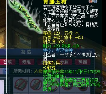 二玩家 一发入魂 鉴定出了 120级 伤害427 命中451 耐敏双加