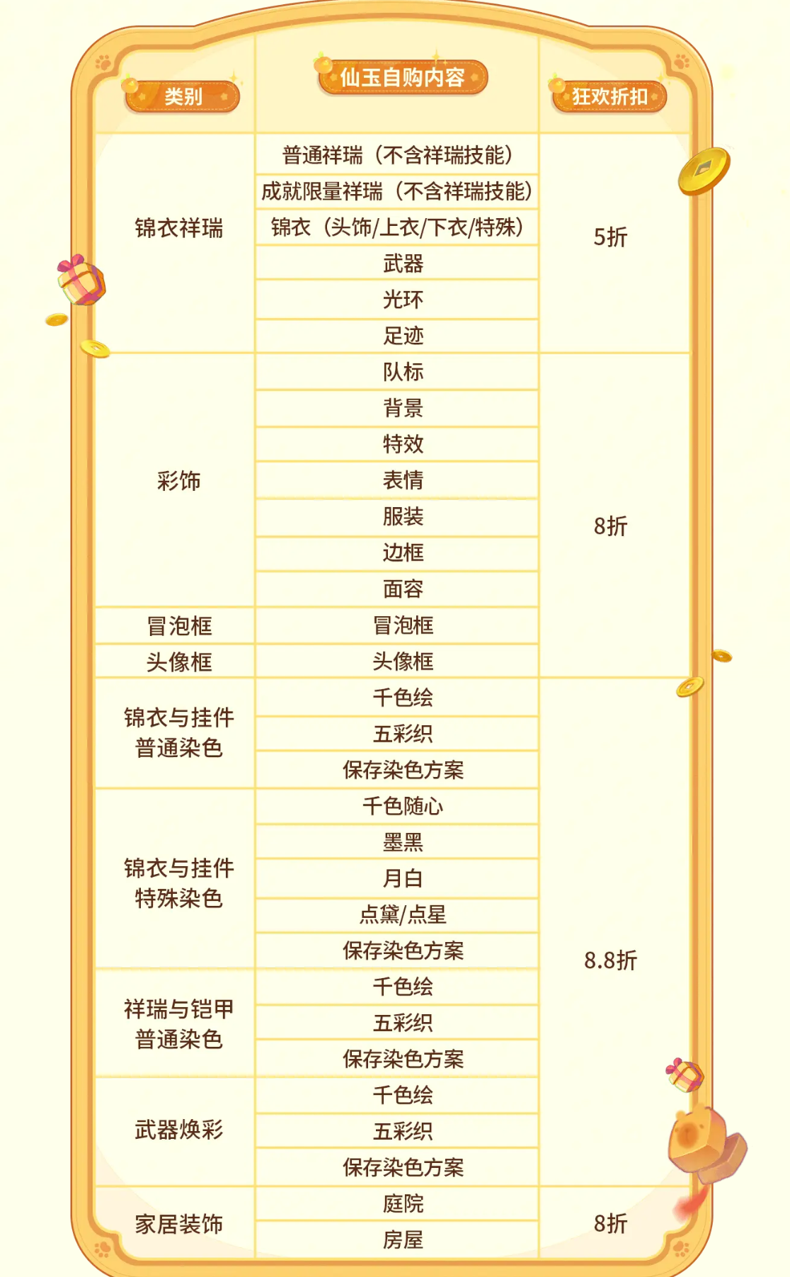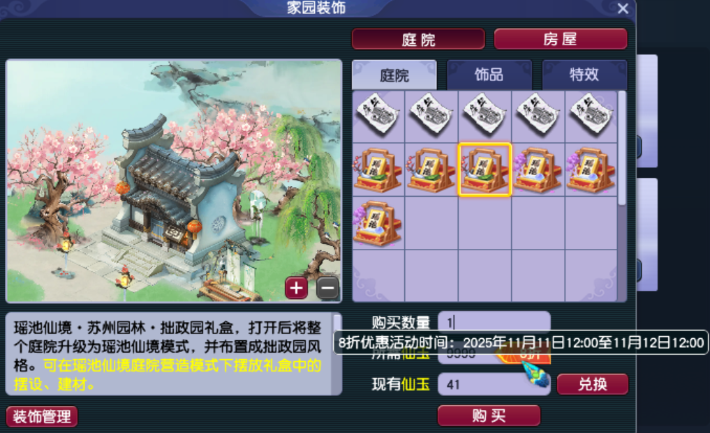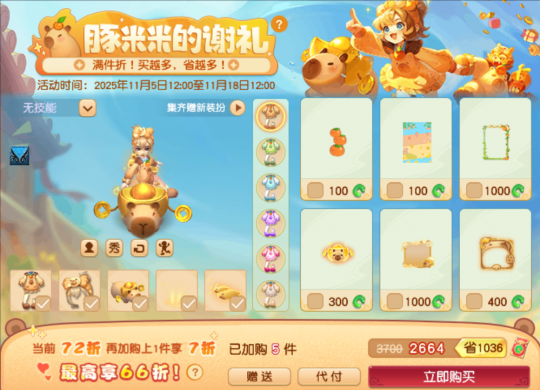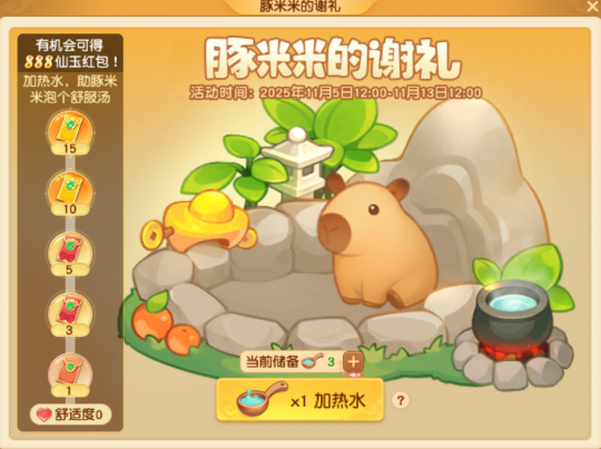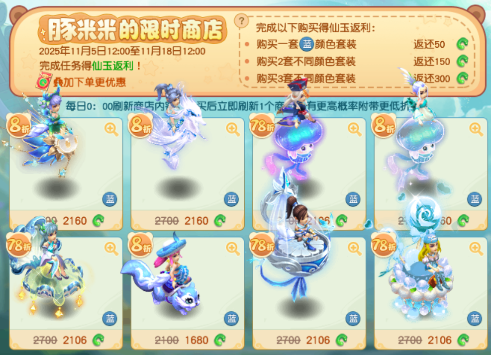 转眼又到了一年一度的“梦幻双11购物节”,今年的“梦幻购物节”不但有超级优惠折扣,还有深受大家喜爱的卡皮巴拉系列新款和888仙玉红包赠礼。 激动的心颤抖的手,下面,就让我们一起了解今年“梦幻购物节”的细节吧! 【888仙玉红包赠礼欢度双11】 2025年11月5日至11月13日,双11特别活动“豚米米的谢礼”重磅来袭。 活动期间,各位玩家可前往长安城(226,109)豚米米的好友处通过照顾豚米米获得舒适度。当舒适度达到指定数值后,大家即可领取仙玉红包,红包额度最高可达888点仙玉,具体如下: 需要说明的是,仙玉红包不仅能和“狂欢折扣”、“新品优惠”、“限时商店”等双十一优惠活动同享,还可以叠加其它单品优惠券使用,各位玩家如果错过这波福利,当真要追悔莫及哦。 【双11海量优惠活动来袭】 那么问题来啦,今年“梦幻购物节”到底有多少优惠活动呢?别急,且听我娓娓道来: 1、“双11新品折上折” 2025年11月5日至11月18日,购买全新双11系列外观,选购件数越多,获得优惠越多,具体如下: 2、“双11疯狂折扣” 2025年11月11日至11月12日,狂欢折扣日,超值购不停!活动期间,霓裳宝阁全场打折,最低折扣低至五折,具体如下: 友情提示:双11当天,包括月白、墨黑、点星、点黛在内各种染色均享受8.8折优惠,这可是各位玩家“弥补遗憾”的绝好机会哦。 3、“限时商店” 2025年11月5日至11月18日活动期间,各位玩家可点击霓裳宝阁“限时商店”进入“豚米米的限时商店”界面。 “限时商店”内的商品会随机附带3折至8折不等的折扣,成功购买商品后,将会立即刷新一个新的商品,并且有更高概率附带更低折扣! 温馨提示:购买指定颜色套装可获得仙玉返利,最高返利达到300点仙玉哦。 【双11好物种草】 最后,为各位玩家推荐一些非常值得在双11购入的锦衣祥瑞: 1.卡皮巴拉系列 今年双11上新的系列外观以当前大火的卡皮巴拉为设计原型。可爱憨憨的设计元素既契合梦幻的可爱画风,又十分潮流。 值得一提的是,同时拥有“卡皮巴拉”锦衣和“豚米米”祥瑞,可解锁豚米米的新装扮。解锁后可在祥瑞界面找到豚米米切换装扮,一只祥瑞两种风格,大家还在等什么呢? 2.小蜜蜂系列 “蜜蜂嗡嗡”锦衣搭配“甜甜蜜蜂”祥瑞绝对能让各位玩家瞬间回想起童年的感觉。不得不说,甜甜的梦幻玩家实在太适合蜜糖一样的小蜜蜂装扮啦! 3.苏州园林系列庭院 喜欢“收拾庭院”的玩家千万不要错过在双11当天以8折的优惠价格购入苏州园林系列庭院的机会!从此,“写意江南,水墨仙境”伴君左右,每天回家都是享受! 以上就是2025年“梦幻双11购物节”的各种活动和好物推荐哦! 编辑:百晓生