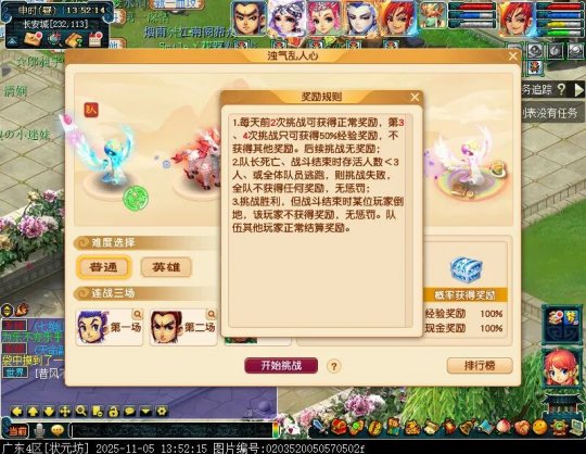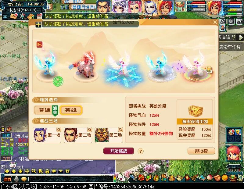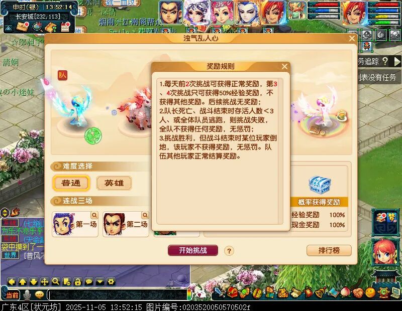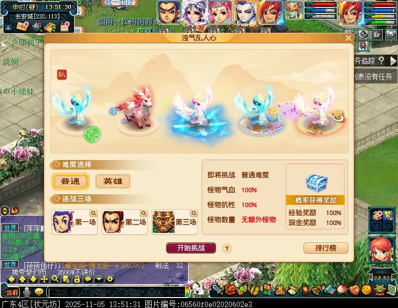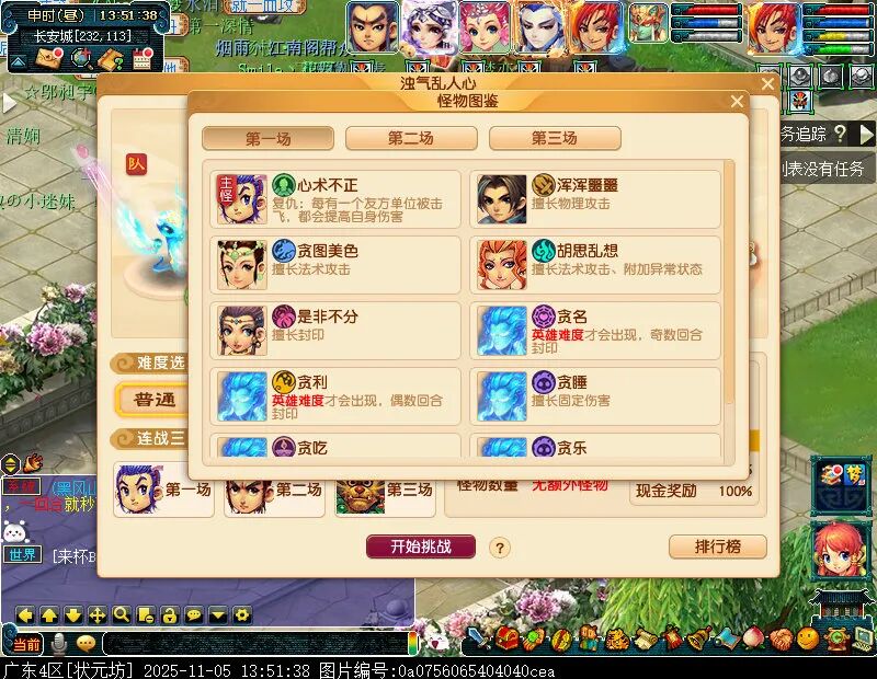 回春堂的郎中最近接收了不少表现反常的青年,郎中们怀疑是有浊气侵入其体内,少侠可帮忙驱逐浊气。 活动期间全天,玩家(角色等级≥50级,5人组队)可在长安城(232,117)情缘仙子处选择“浊气乱人心(挑战怪)”开启玩法。 这次的挑战玩法包含三场连续战斗。 点击放大镜可以看到怪物的特性,其中英雄难度会多出只蜃气妖,有点像高星地煞。 玩家每天前两次可获得正常奖励,所以每天刷两次就完事了。 下面开始测试普通难度。 星灵仙子,开场一次性召唤满怪物,小怪清完后继续召唤两波。 第一波: 龙太子:五庄,会烟雨剑法/破血。 飞燕女:中速女儿,会雨落寒沙。 狐美人:女魃墓,会谜毒之缚。 舞天姬:龙宫,会龙腾。 偃无师:大唐,会横扫。 蜃气妖:地府会阎罗令,无底洞会地涌金莲。 其余怪物死亡,龙太子将继承其能力。 建议封印龙太子及偃无师。 第二波: 神天兵:龙宫,会龙卷雨击。 桃夭夭:凌波,会翻江搅海/浪涌。 巨魔王:魔王,会牛劲。 飞燕女:神木,会落叶萧萧。 剑侠客:化生,会推气过宫。 蜃气妖:地府,会幽冥鬼眼。 主怪回合结束后会点名下一回合要点杀的目标。 建议封印桃夭夭。 第三波: 虎头怪:狮驼,会变身,可封印。 巨魔王:狮驼,变身后鹰击。 鬼潇潇:盘丝,会瘴气。 骨精灵:魔王,牛劲后飞沙走石。 龙太子:五庄,会日月乾坤/生命之泉。 蜃气妖:会野兽主怪/化生会金刚护法,无底洞会地涌金莲。 若敌方产生击杀,将恢复主怪气血。 建议封印巨魔王及虎头怪。 战斗胜利后的奖励如图所示,因是连续战斗,注意别让化生秒出去,以免影响持续恢复能力。 英雄难度与普通难度的奖励区别,在于经验和现金奖励会高一点。 这次排行没啥作用,英雄难度只多出了个称谓。 再附上系统的一些玩法说明,磨磨唧唧一大堆,感觉没什么用,这玩法总结就是难度不大,所以奖励也不高,平民建议刷个普通难度,硬件高点的可以挑战英雄难度,拿多点奖励,但要多付出一点时间。 编辑:百晓生