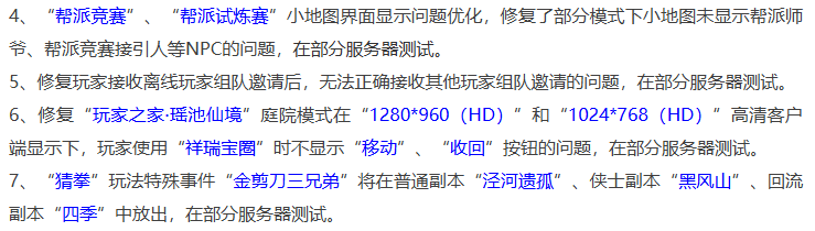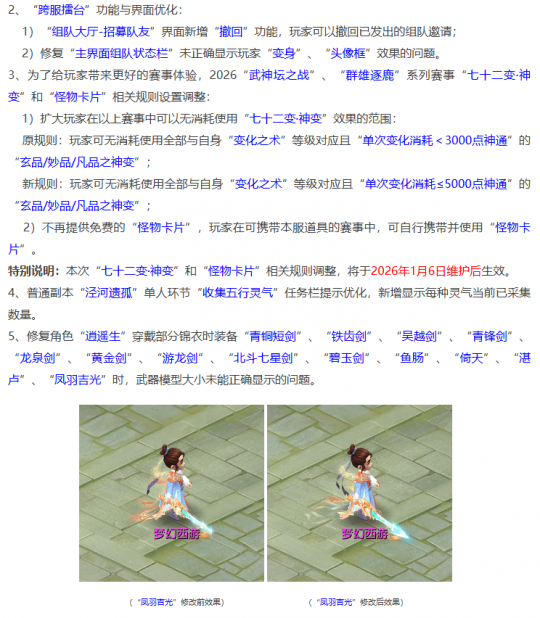 在梦幻西游里面,每周二系统维护很多玩家都比较关注,本周正好在双十一期间,系统开启了狂欢折扣活动,对于想低价买飞行祥瑞的五开来说确实是一个好机会,下面一起来看看本周的具体维护情况吧。 电脑版全服放出内容:双十一活动全服开放,11月11日至12日期间,有狂欢折扣活动,锦衣、祥瑞5折可以采购。再加上此次活动系统赠送的仙玉红包,抽到888免费仙玉的玩家,直接可以白嫖到飞行祥瑞了。 跨服擂台功能与界面优化,组队大厅界面新增撤回功能;2026武神坛之战、群雄逐鹿系列赛事中“七十二变神变”和“怪物卡片”相关规则设置调整;普通副本泾河遗孤单人环节优化;修复逍遥生穿戴部分锦衣时装备大小显示问题。 优化东海渊新手任务的战斗难度,这一点改动却是很有必要,新手玩家想要加人东海渊门派,前期战斗难度没有一定运气和操作真的很容易翻车,加入门派都非常困难;角色战斗信息清晰可读;修复召唤兽技能无畏布施持续回合结束后效果移除时可能会错误移除召唤兽特性鼓舞的问题。 下面是本周测试服的维护情况,首先是飞升降级问题,飞升降级后若玩家当前穿戴装备不满足飞升降级穿戴条件,需脱掉装备才可以飞升;召唤兽合纵技能表现优化,战斗中显示合纵、高级合纵、超级合纵技能生效状态;看戏戏票方式改动,可以一键购买全部当前可用戏票。 帮派竞赛、帮派试炼赛小地图界面显示问题优化;修复玩家接受离线玩家组队邀请后无法正确接受其他玩家队伍邀请的问题;修复瑶池仙境庭院模式高清显示问题;猜拳玩法中“金剪刀三兄弟”将在普通副本泾河遗孤、侠士副本黑风山、回流副本四季中放出,该说不说这个金剪刀真的好用,特别是杀法宝任务的时候,想赢实在是太难了。 好了,本期的内容到此就结束了,喜欢表弟的记得点赞。 编辑:百晓生