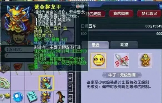 大家好!「烤鸭看西游」每天为你带来不一样的故事。 一、玩家炸出12JN须弥谛听 这位少侠通过一组巅峰炼妖,成功炸出一只12JN须弥谛听。要是完美打书,就能节省一本千亿兽诀的费用了,有点美滋滋。 二、欧皇斩获150无级别法系铠甲 玩家鉴定出了150级防御246且魔敏双加57的无级别男衣服。这是X9法系玩家的“梦中情衣”,能轻松卖个好价格。 三、旭旭宝宝亲手鉴定100级野兽男头 旭旭宝宝在【龙拳】鉴定100级装备时,炸出一个野兽男头, 还有一件破血男衣,刚好能给大唐号携带! 四、玩家展示140无级别剑 玩家展示自己鉴出的140无级别剑,并光速打到5锻和完成造型转换,这武器打完15锻能到873伤,属于很高端的X9武器。 编辑:百晓生