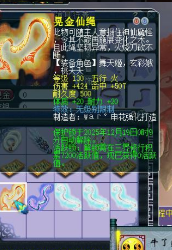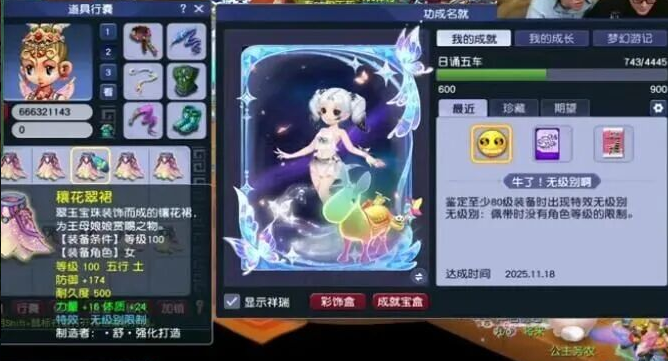 玩家展示新鉴定出的130级伤害424、命中507的体耐双加无级别飘带,他表示终于圆了多年来的游戏梦想。