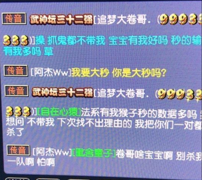 大家好!「烤鸭看西游」每天为你带来不一样的故事。 一、风少让菠萝立下剃头军令状 风少确认紫禁城将携带3千万战神出征本月武神坛,还让主指挥菠萝立下军令状,要是不夺冠就免指挥费了。菠哥则回应:要是三千万没夺冠,比如说剃个头、染个头啥的都没事,但不给指挥费那是昏厥的,而小王表示别说头发,全身剃光都没事。 二、金戈铁马服战五庄抓鬼遭歧视 【金戈铁马】服战五庄抓鬼惨遭歧视,发传音发泄情绪:抓鬼都不带我?你宝宝有我好吗,秒得输出有我多吗?要是不给个理由,就勾魂一队。 三、爆总团队炸出100无级别腰带 畅玩服【齐天大圣】的爆总团队鉴定出了100级无级别腰带,腰带在出了无级别之后,也是直接去附魔,结果三发就出了变身套。 四、做师门要世界收宠 来自将军服务器玩家发文:师门店全空,甚至世界开始收师门宠。最近找宠物3分钟起步,要命了。 编辑:百晓生