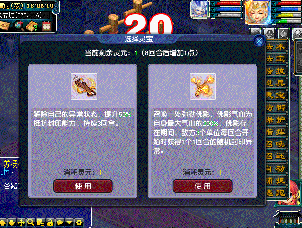三级法宝为“如意金钵”,无需佩戴,每次使用消耗5点灵气,冷却回合为8,但需注意只能作用到被你封印的目标。