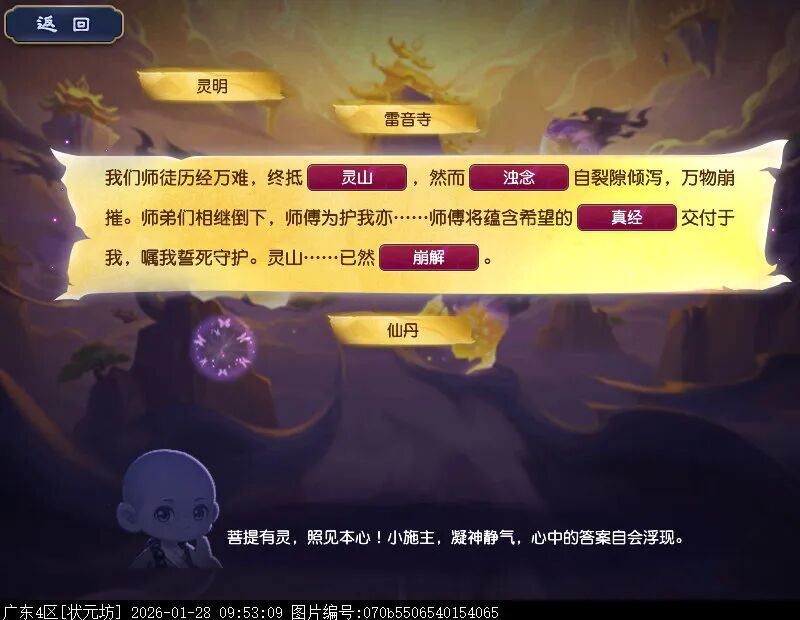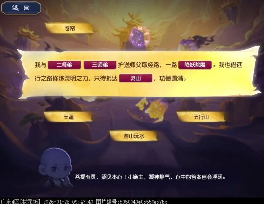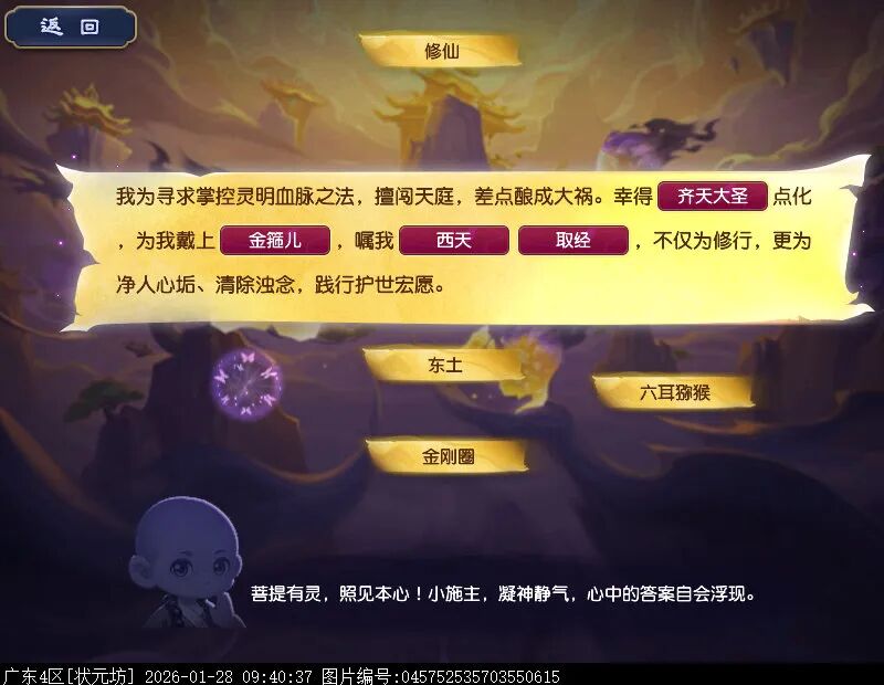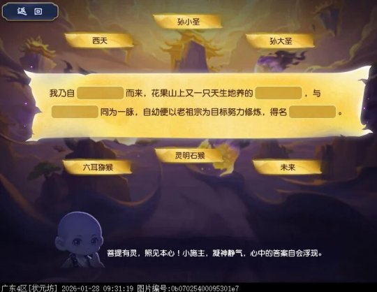 灵山崩解,真经破碎,浊念吞噬天地,灵明之子“孙小圣”坠入异界,他能否成为拯救破碎时空的希望? 玩家可前往长安城(309,206)涂山瞳处开启全新单人剧情玩法“灵明之子”寻回真相! 进入玩法后,玩家会化身为孙小圣,探寻入世真相。 击败圆福小和尚。 然后。。。第二回合被对方秒了。 下面的剧情和灵猴出世副本类似。 冲破灵石缝隙。 一回合就把怪物秒了。 后面会多次出现填词玩法。 依次填入“未来、灵明石猴、孙大圣、孙小圣” 向天兵天将解释原委。 主怪:天宫,会错乱。 天将:天宫,会五雷轰顶。 天兵:普攻。 其他怪物,被助战秒了。 第二次填词,这么填(齐天大圣、金箍儿、西天、取经)。 赶走毛虫。 草叶虫:无底洞,会夺魄令。 击败后西瓜当前喊话,成功采摘,即可结束战斗。 击败妖魔头子。 怪物没机会出手。 师父:化生,会金刚护体。 三师弟:天宫,会五雷轰顶。 第三次填词。。。 击败混元 使者,真懒,新形象不放进来,拿只鬼将凑数了。 主怪:一下把二师弟击倒。 小怪:没机会出手。 二师弟:高速物理,会横扫两下。 最终之战,突破混沌之隙。 小怪:秒一下完了。 二师弟、师父:被主怪抓一下挂了。 随便秒下主怪就能结束战斗。 最后一次填词。。。 填完看CG动画。 然后拓印两个字,看下剧情,就能达成整个剧情了。 最终奖励...1点成就是亮点。 编辑:百晓生