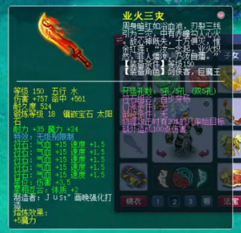 随后亮相的两件装备同样令人瞩目:一件150级耐魔双加的无级别刀,已上18段宝石,并熔炼了5点魔力;