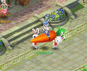 首先,我们来看看坐骑的外观...是两只白色的大兔子扛着一根硕大无比的萝卜在跑!这真的是坐骑吗?认真的吗?还真别不信,这确实就是坐骑,人物就是这样坐在大萝卜上被两只大兔子扛着跑的...是不是很好地诠释了“欢乐”两个字?我第一眼看到时都笑出猪叫了。