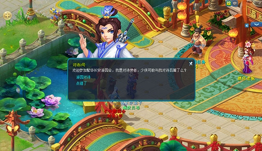见证了逍遥世界的武力江湖,当然也要去看一看民间文学才艺咯。国庆活动期间,每晚18:00-20:00长安城内将开启游园会活动,届时将在长安城内各处刷新15个NPC,玩家可前往寻找并完成对诗、猜谜、寻物等相应活动并获得奖励(子女仙丹、宝石、女娲石、资质丹等)。每位NPC最多可获得1次奖励。