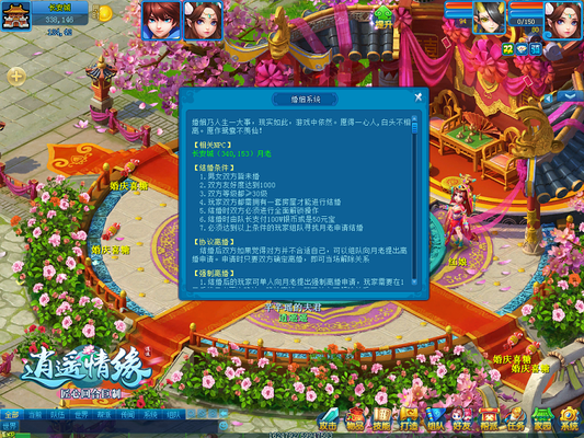 对爱情,最美好的想象不过是“一屋两人三餐四季”,在逍遥世界,最好的爱情应该算是两人执手、神仙眷侣、仗剑天涯。有了心上人就组队带TA去长安城(340,153)月老处登记结婚吧,毕竟遇上一个对眼的人不容易,切记结婚是需要钱的,所以队长需要准备100W银币或者50元宝。